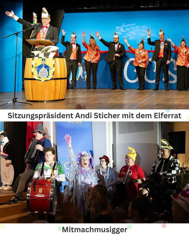 Wenn sich die Mitmachmusiggermusizierend auf den Weg vom Foyer in Richtung Bühne machen, bedeutet das, dass es gleich losgeht. Nachdem die Büttenbeischlafer, die Pingus, die riesige CCSW-Fahne über die Köpfe der Fassenachter schweben ließen und die Staanemer Fastnachts-Hymne von Daniela Vogt, Enkelin des Verfassers Norbert Imgram, angestimmt wurde, folgte der umjubelte Einzug des Elferrates und die Begrüßung der zum Großteil kostümierten Gäste durch Sitzungspräsident Andi Sticher.